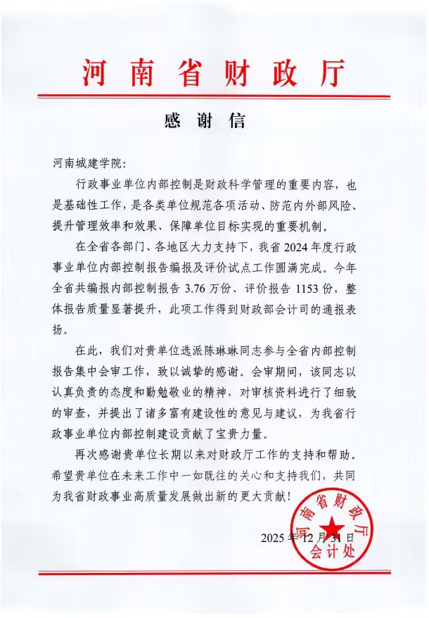 近日,我校收到河南省财政厅会计处发来的感谢信,感谢财务处陈琳琳同志在全省行政事业单位内部控制报告会审工作中的突出贡献。陈琳琳专业水平和敬业精神得到财政厅会计处的充分肯定,并协助省财政厅会计处参与了财政部会计司的全国内部控制汇审工作。